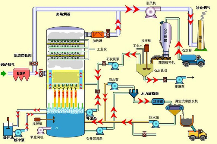“石灰石-石膏”濕法脫硫工藝鍋爐引風(fēng)機(jī)排出的原煙氣由增壓風(fēng)機(jī)導(dǎo)入脫硫系統(tǒng),通過GGH(氣體加熱器)進(jìn)行熱交換后煙氣進(jìn)入吸收塔。鍋爐引風(fēng)機(jī)排出的原煙氣由增壓風(fēng)機(jī)導(dǎo)入脫硫系統(tǒng),通過GGH(氣體加熱器)進(jìn)行熱交換后煙氣進(jìn)入吸收塔。在吸收塔內(nèi),原煙氣自下而上通過塔身,遇噴淋系統(tǒng)噴出的霧狀石灰石漿液逆流混合,脫硫后的凈煙氣經(jīng)噴淋系統(tǒng)上部的除霧器除去煙氣所攜帶的霧滴后排除吸收塔進(jìn)入GGH,經(jīng)過GGH換熱升溫后經(jīng)煙囪排出。