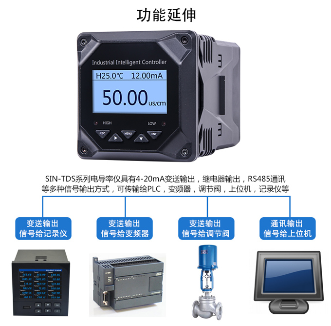 SIN-TDS210工業電導率儀表,可對各種工業用水的電導率(TDS)值進行連續測量和控制,本裝置廣泛應用于科學實驗裝備、化工、制藥、環保、冶金、造紙、食品、飲料及供水等行業。根據水工業的環境和特點結合國際供電標準,考慮了特殊環境的電氣設計規范,增加了220VAC供電。