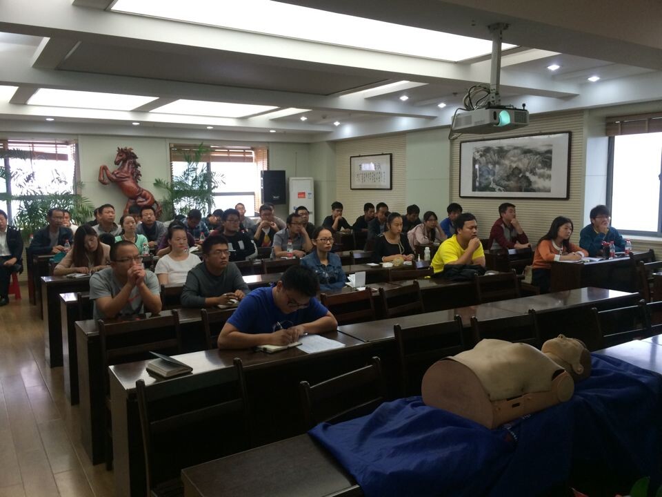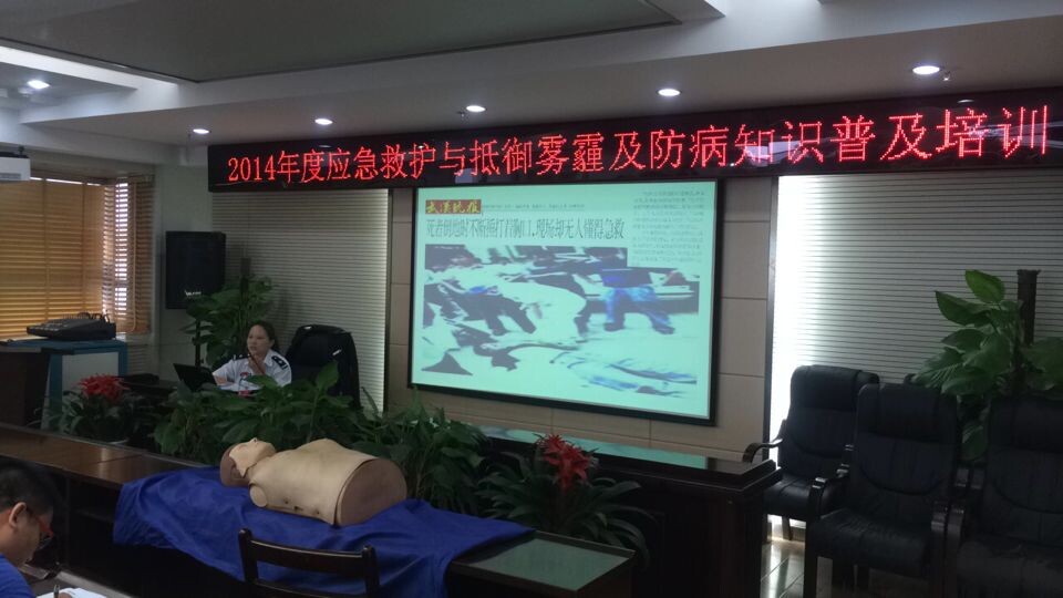 培訓包括三部分,汪主任首先從職業(yè)健康安全角度出發(fā),詳細介紹了人體的幾大穴位以及按摩的方法;現(xiàn)場演示模擬了心肺復蘇和人工呼吸的搶救;最后對當下霧霾天氣的產(chǎn)生和影響作了簡單介紹,并告訴我們?nèi)绾蔚钟溆绊憽?/FONT>