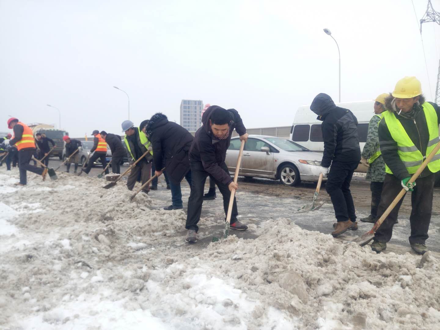 1月28日,公司廣大職工不畏低溫嚴(yán)寒,來到三環(huán)線(龍陽大道~漢陽大道)路段,繼續(xù)奮戰(zhàn),男女齊上陣。期間,漢陽區(qū)委書記馬澤江、集團(tuán)公司董事長嚴(yán)悌文等領(lǐng)導(dǎo)來到現(xiàn)場指揮工作,為廣大建設(shè)者鼓勁兒加油,下午2點(diǎn),基本完成主干道清掃,車輛予以通行,截至5點(diǎn),徹底完成三環(huán)線(龍陽大道~漢陽大道)路段的積雪清掃工作。隨后,鏟雪隊(duì)伍搶抓時(shí)間,來不及休息便再一次來到琴臺(tái)大道對(duì)昨夜的積雪進(jìn)行二次清除,進(jìn)一步拓寬快車道,下午6點(diǎn)30分完成拓寬任務(wù)。