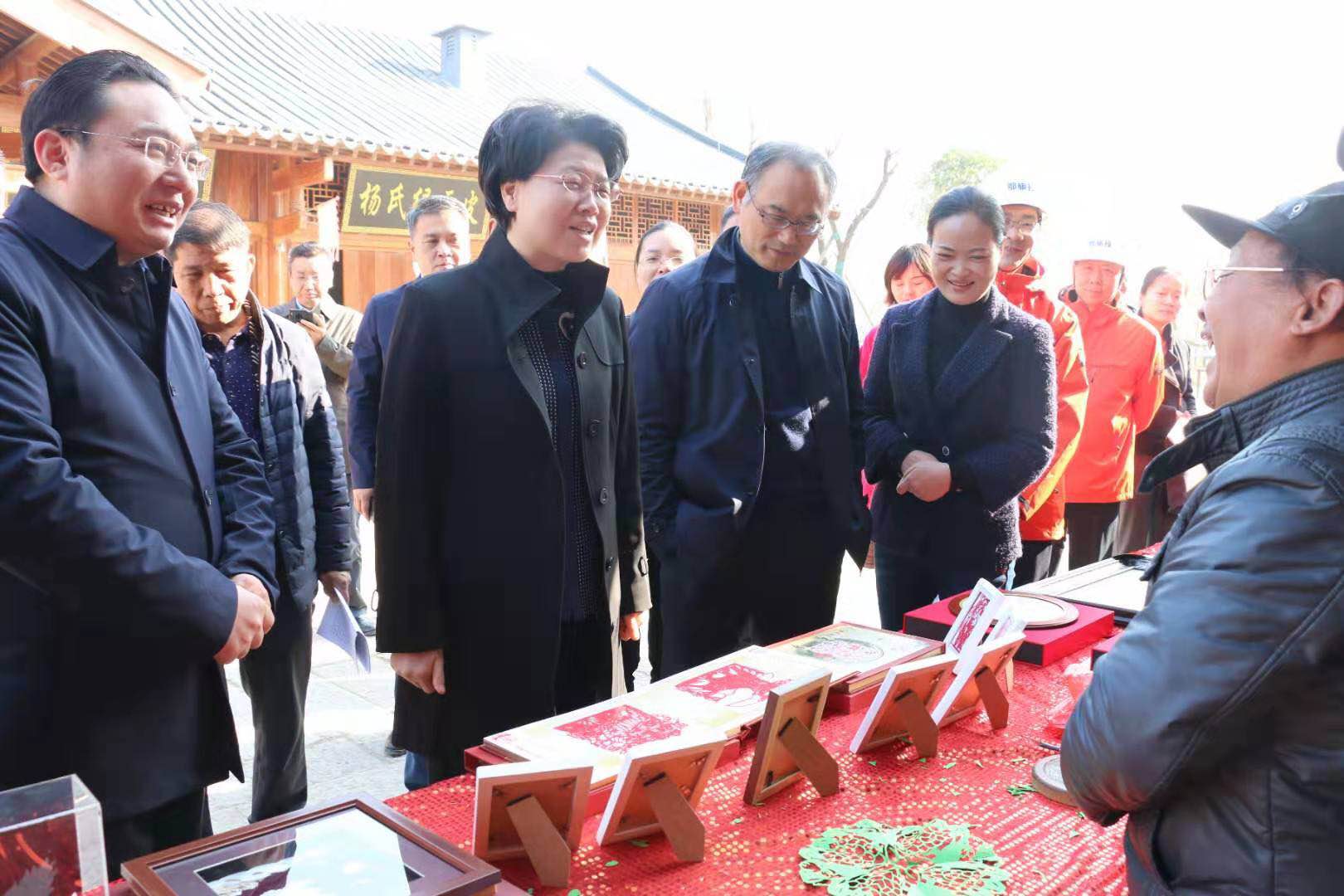 肖菊華一行走進項目現場,在項目負責人的陪同和講解下,參觀了沔陽小鎮(zhèn)迎客廳、商業(yè)街、云野夢田服務中心及樣板間等區(qū)域,并觀賞了沔陽傳統花鼓戲《站花墻》選段,欣賞了沔陽非物質文化遺產代表作雕花剪紙、沔陽貝雕、麥稈畫等。肖菊華在考察項目建設情況的過程中,親切地同文化傳承老藝人進行了交流,一方面肯定了老藝人們對沔陽文化的堅守,另一方面對項目整體設計和構造所呈現出來的獨特文化展示平臺表示了認可。
