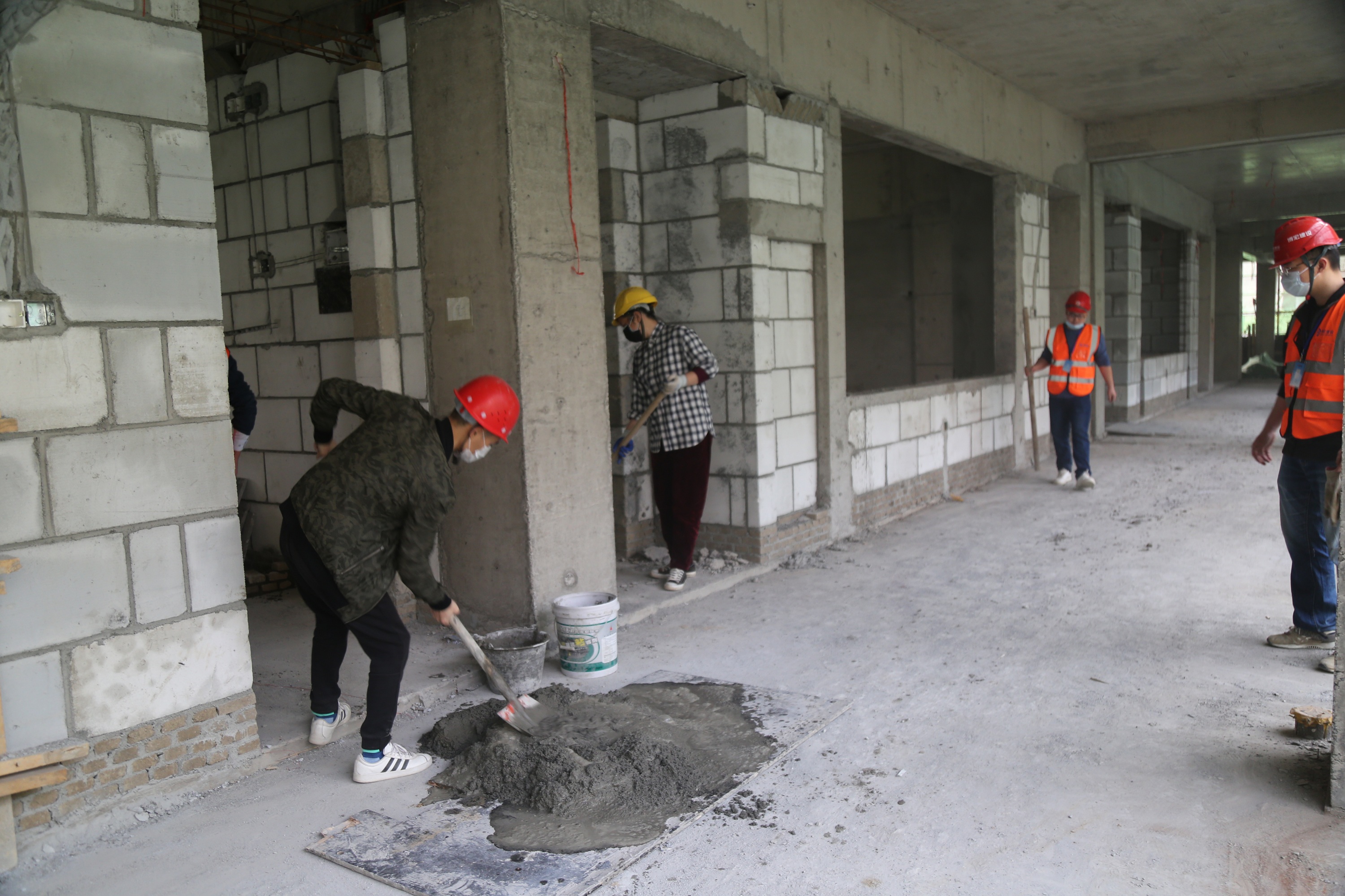 據(jù)項目負責人介紹,目前龍陽中學項目已到崗工人60余人,當下主要施工任務(wù)是部分樓棟進行內(nèi)架拆除、砌體施工、水電安裝等。在經(jīng)過嚴格的場地消毒、進場測溫和登記等防疫程序后,現(xiàn)場管理人員和工人們陸續(xù)進場,一進場大家就忙活起來了,有的及時對地面凹陷進行覆蓋,有的在上樓為墻面砌筑拌灰,旁邊樓棟里也傳來了“當當當”的鋼管架子拆除聲音。大家對期盼已久的復工都干勁十足,項目起步就是沖刺,開啟“白+黑”兩班倒模式,已連續(xù)兩個夜晚進行施工,誓要把因疫情耽誤的工期盡快趕上。