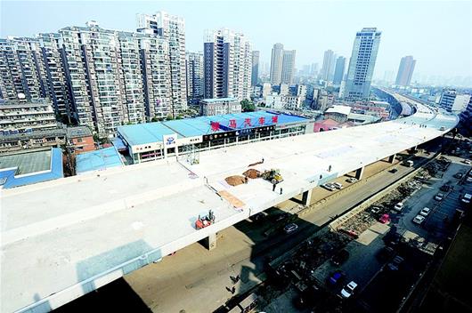 昨日,記者來到雄楚大街改造工程指揮部發(fā)現(xiàn),這里異常繁忙,工人們都在忙著搭腳手架、趕進度。記者看到,雄楚大街高架梅家山立交至武漢理工大學段橋面已全線貫通,整條高架已成形。對接二環(huán)線珞獅南路高架的接線,正在緊張施工中。施工方介紹,昨日貫通的一段將于今年五一通車。據(jù)了解,二環(huán)線漢陽方面,只剩下龍陽大道墨水湖北路至知音橋段仍在施工中,其他路段均已通車。