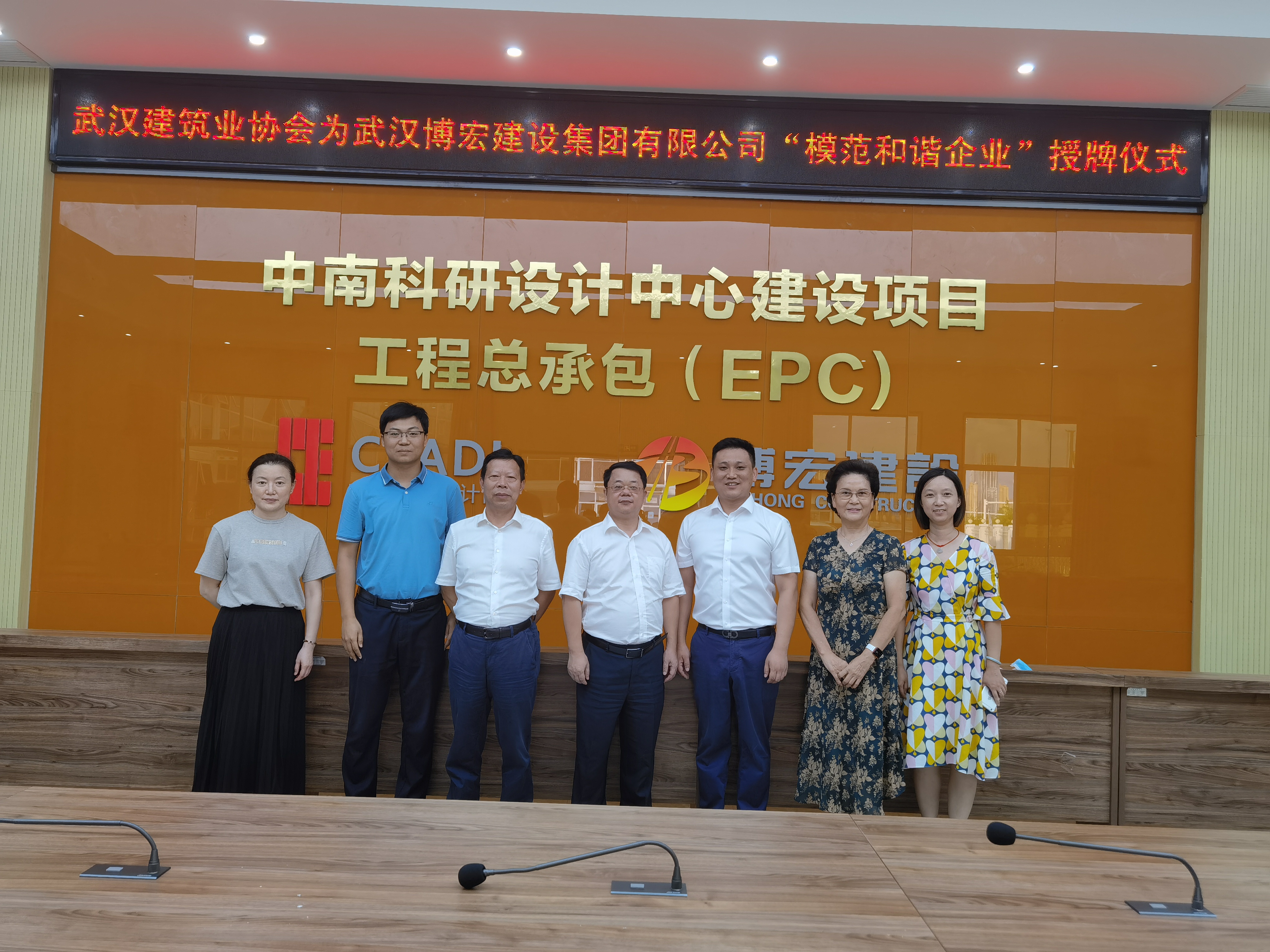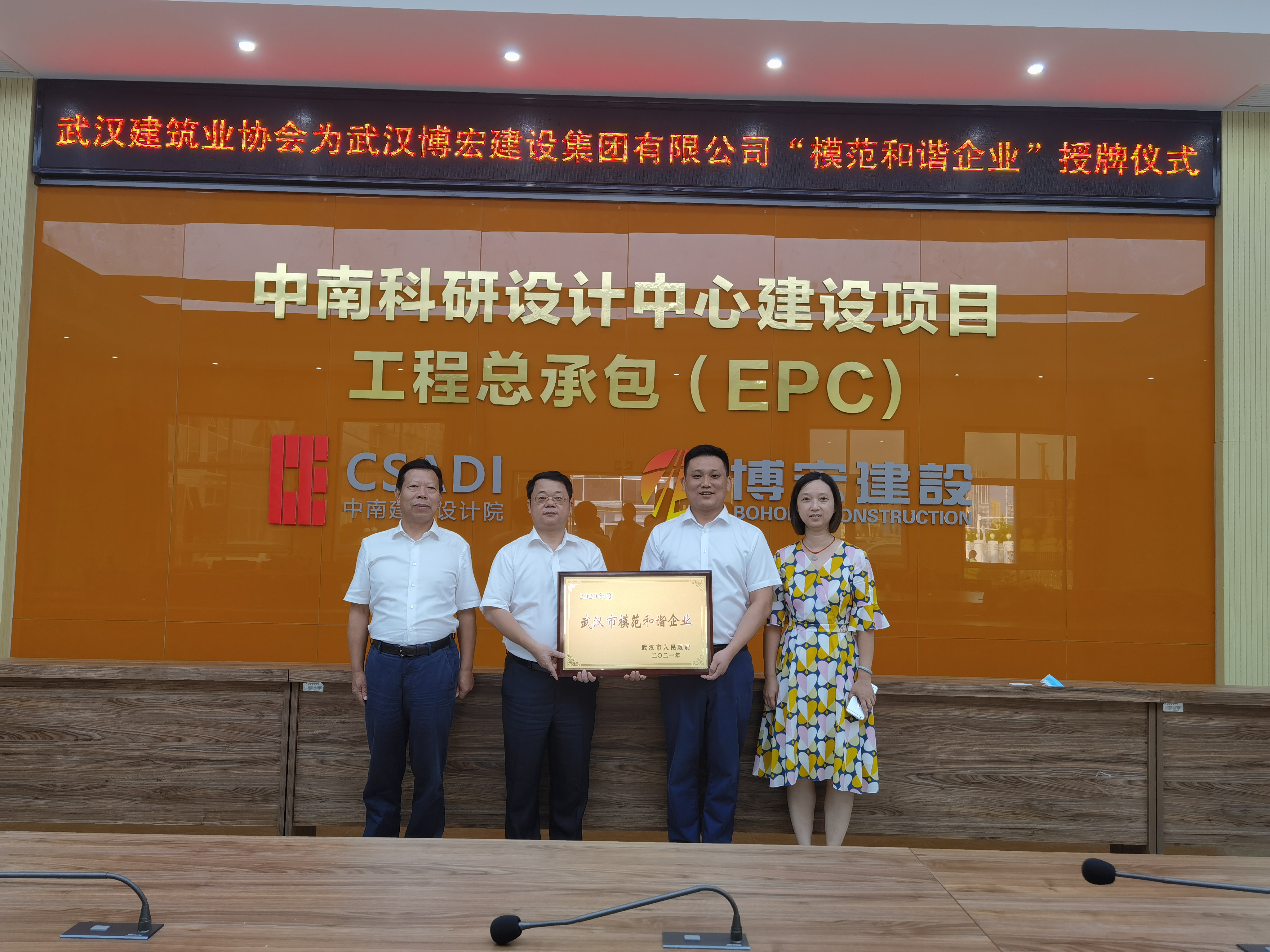 9月14日下午,博宏建設(shè)“武漢市模范和諧企業(yè)”授牌儀式在博宏建設(shè)承建的中南科研設(shè)計(jì)中心項(xiàng)目順利舉行。武漢建筑業(yè)協(xié)會副會長劉慶、秘書長李紅青、總工程師工作委員會副主任安維紅,博宏建設(shè)總經(jīng)理蘇琦、黨支部副書記郭一清、總經(jīng)理助理周昌文參加儀式。