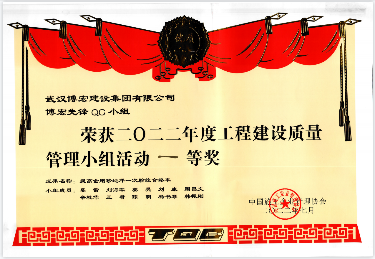 近日,由中國施工企業(yè)管理協(xié)會主辦的“2022年工程建設質量管理小組競賽活動復賽和決賽”已圓滿結束,由我司報送的4項成果經歷層層角逐,在全國1113個成果中脫穎而出。其中博宏先鋒QC小組的代表成果《提高金剛砂地坪一次驗收合格率》榮獲一等獎、芳草云天QC小組的代表成果《地下室外墻單側支模體系研制》與鸚鵡晴川QC小組的代表成果《提高疊合板施工一次驗收合格率》榮獲二等獎、博宏機電之星QC小組的代表成果《提高消防噴淋頭安裝定位準確率》榮獲三等獎,博宏建設集團QC成果再次取得重大突破!