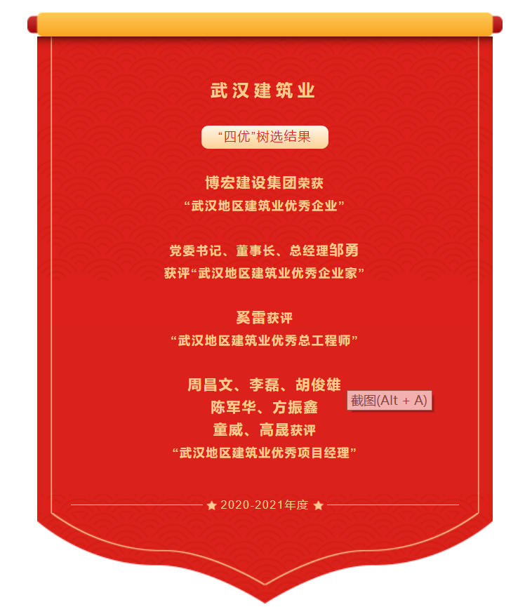 ? ? ? ? 近日,武漢建筑業(yè)協(xié)會(huì)發(fā)布2020-2021年度武漢地區(qū)建筑業(yè)優(yōu)秀企業(yè)、優(yōu)秀企業(yè)家、優(yōu)秀總工程師、優(yōu)秀項(xiàng)目經(jīng)理(以下稱為“四優(yōu)”)選樹結(jié)果。經(jīng)會(huì)員單位自主申報(bào)、協(xié)會(huì)組織專家評(píng)審、主管部門復(fù)核、武漢建協(xié)三季度會(huì)長(zhǎng)辦公會(huì)審議通過(guò)并在協(xié)會(huì)網(wǎng)站進(jìn)行公示,“四優(yōu)”選樹結(jié)果名單火熱出爐。博宏建設(shè)集團(tuán)榮獲“武漢地區(qū)建筑業(yè)優(yōu)秀企業(yè)”;黨委書記、董事長(zhǎng)、總經(jīng)理鄒勇獲評(píng)“武漢地區(qū)建筑業(yè)優(yōu)秀企業(yè)家”;奚雷獲評(píng)“武漢地區(qū)建筑業(yè)優(yōu)秀總工程師”;周昌文、李磊、胡俊雄、陳軍華、方振鑫、童威及高晟獲評(píng)“武漢地區(qū)建筑業(yè)優(yōu)秀項(xiàng)目經(jīng)理”。