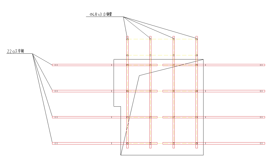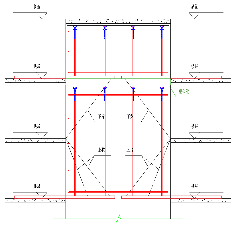 該技術通過采用兩道16#工字鋼懸挑(一道布置在屋面層,一道布置在屋面層-2層),分別設置下?lián)渭吧侠姆绞酱钤O支撐平臺,再利用此平臺為基礎搭設支撐架和外腳手架,既用于結構施工,同時兼作安全防護,有效降低了操作人員的安全風險,對結構安全性有較大保障。