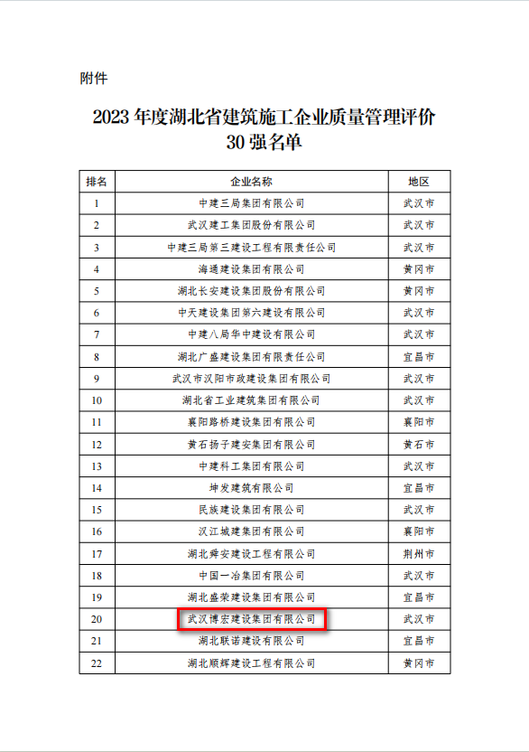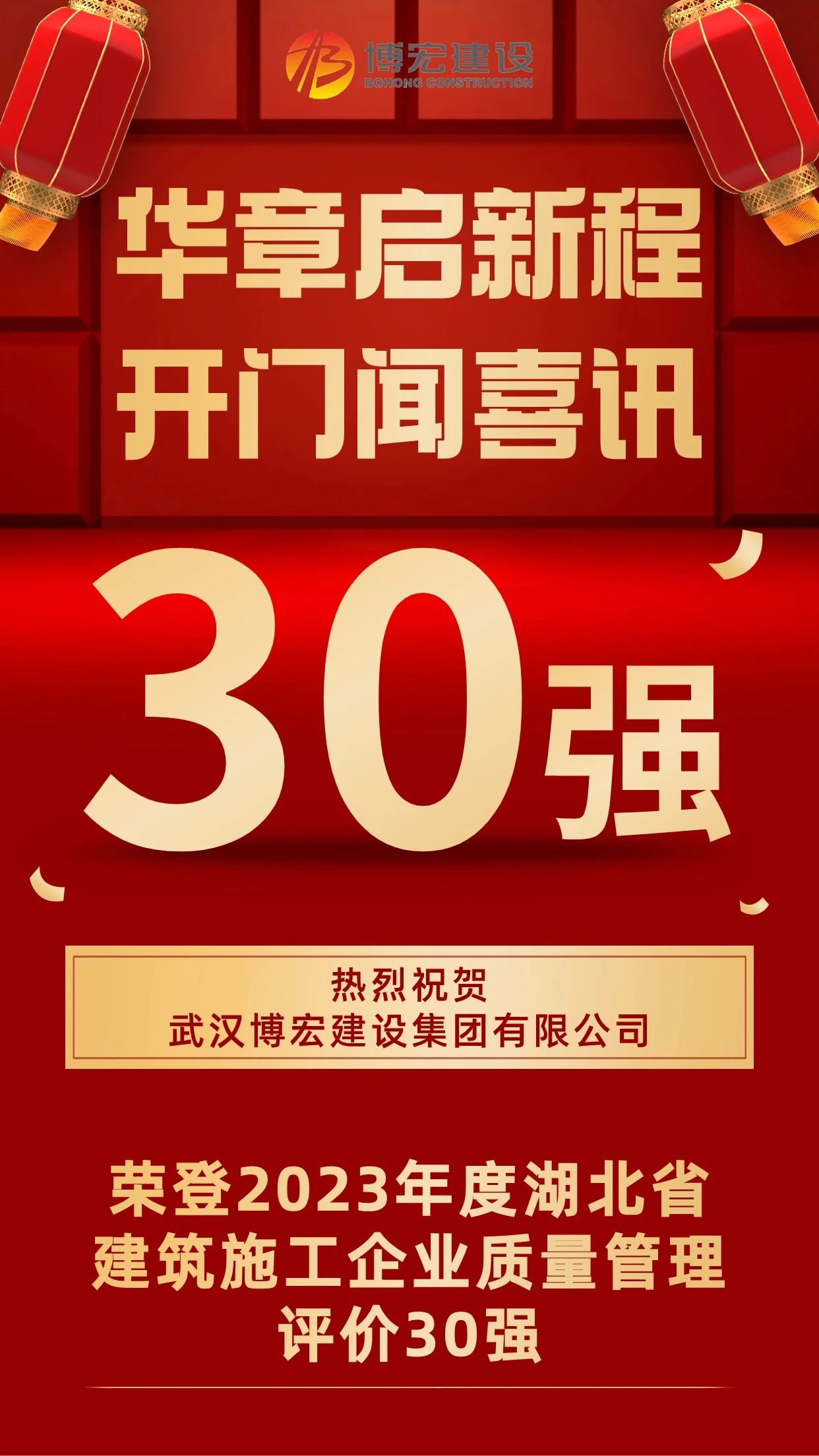 華章啟新程,開門聞喜訊。近日,湖北省建設(shè)工程質(zhì)量安全協(xié)會公布2023年度湖北省建筑施工企業(yè)質(zhì)量管理評價30強(qiáng)名單,博宏建設(shè)集團(tuán)榮耀登榜!此次上榜是博宏建設(shè)集團(tuán)繼2022年榜上有名后,再次憑借卓越的質(zhì)量管理和施工實力登上榜單。