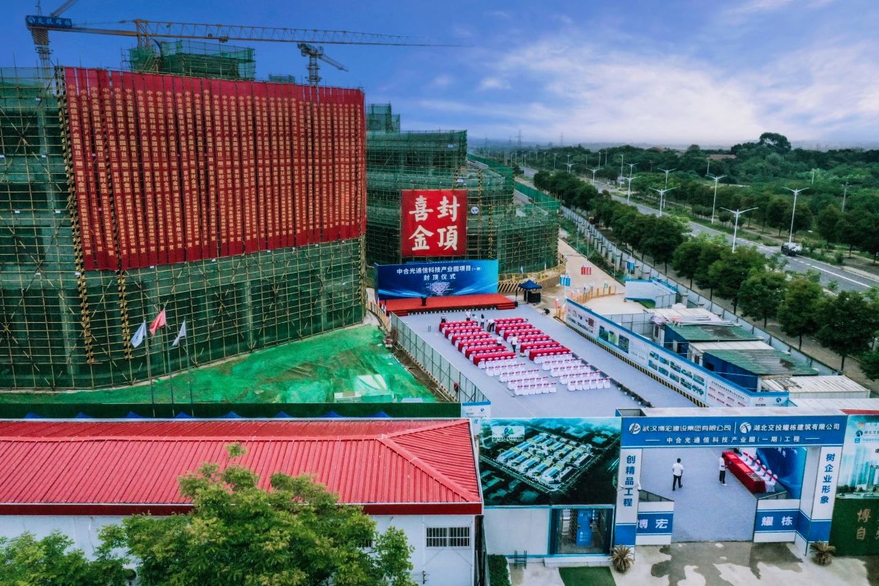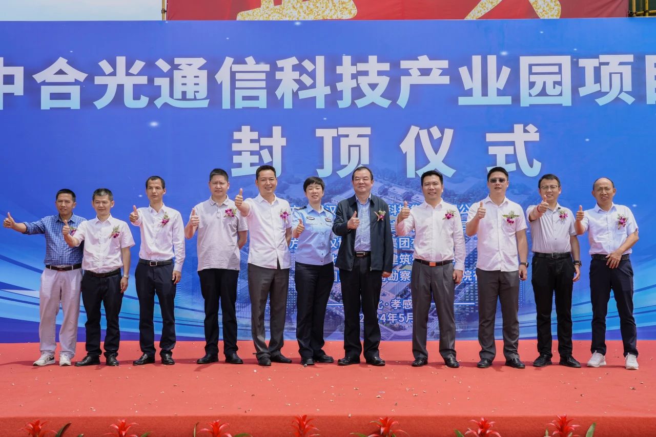 2024年5月9日上午,中合光通信科技產(chǎn)業(yè)園(一期)封頂儀式在項(xiàng)目現(xiàn)場(chǎng)隆重舉行。孝感市人大常委會(huì)副主任、臨空區(qū)工委書(shū)記邱顯春,孝感市臨空區(qū)工委委員、公安分局局長(zhǎng)劉洋,武漢塔子湖集團(tuán)有限公司黨委書(shū)記葉永斌、董事長(zhǎng)胡浩,武漢博宏建設(shè)集團(tuán)有限公司董事長(zhǎng)鄒勇,武漢中合智能科技集團(tuán)有限公司董事長(zhǎng)李劍出席封頂儀式,共同見(jiàn)證項(xiàng)目封頂。湖北交投耀棟建筑有限公司等參建單位相關(guān)領(lǐng)導(dǎo)參加本次儀式。