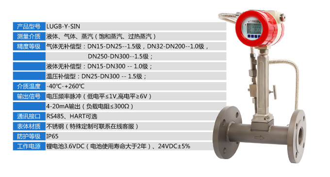 LUGB-Y-SIN高精度渦街流量計對過熱蒸汽、飽和蒸汽、壓縮空氣和一般氣體、水和液體的計量和控制。加厚本體,可有效避免現場管道振動帶來的數據波動和誤差。